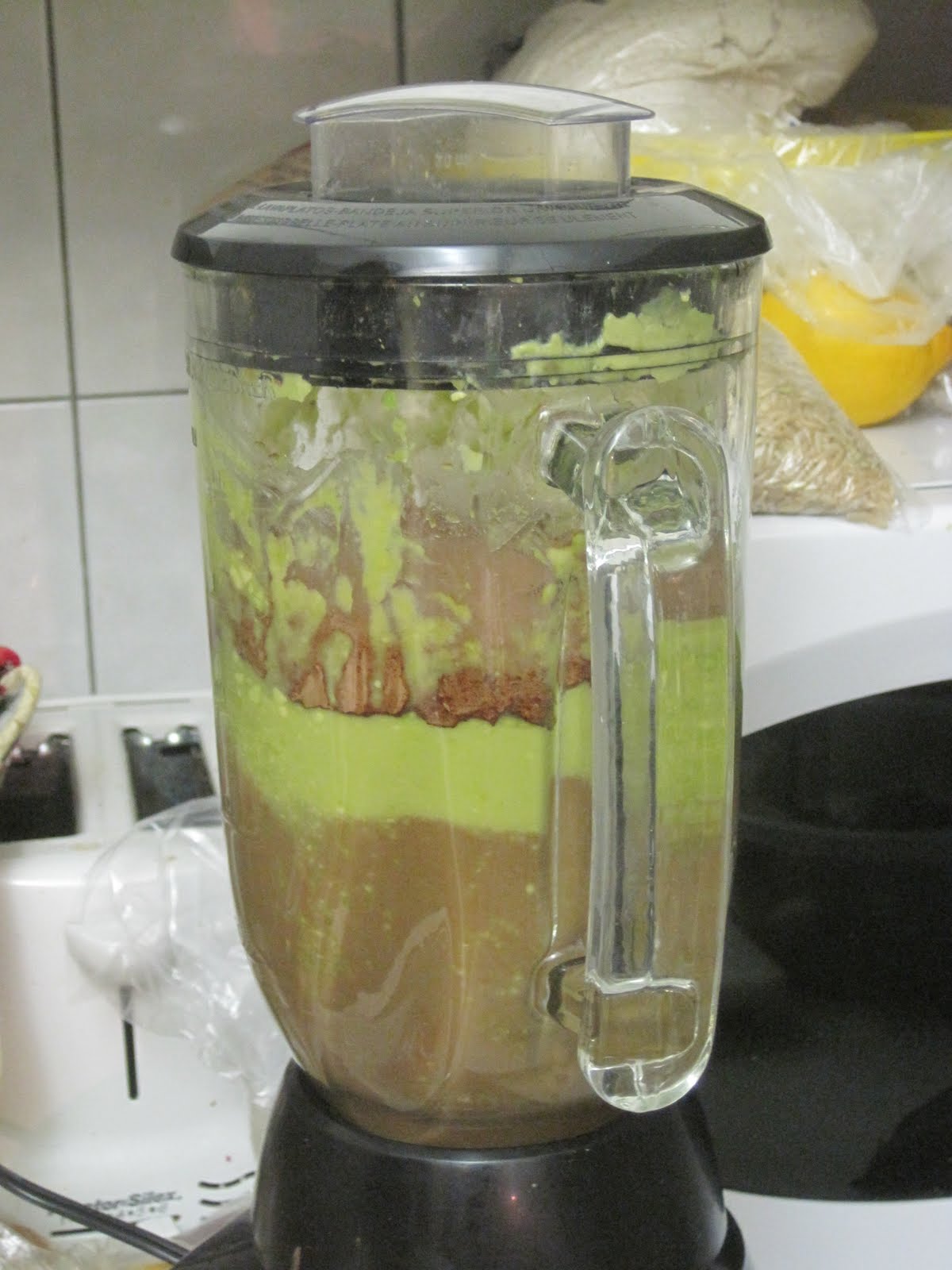 But this is what it started as. First, you combine cocoa powder with avocadoes. Make sure you use ripe avocadoes, very ripe ones, or else you'd spend half the time like my fiance and I chipping at it and chopping it up in the blender. Plus, the mousse was mostly mousse but had tiny chunks of unripe avocado in it. Nevertheless, you have yourself healthy monounsaturated fats and vitamins and minerals. Plus, it is made with agave nectar which is anti-inflammatory and lowers your glycemic index which is both anti-cancer and anti-diabetes. That's power, baby!